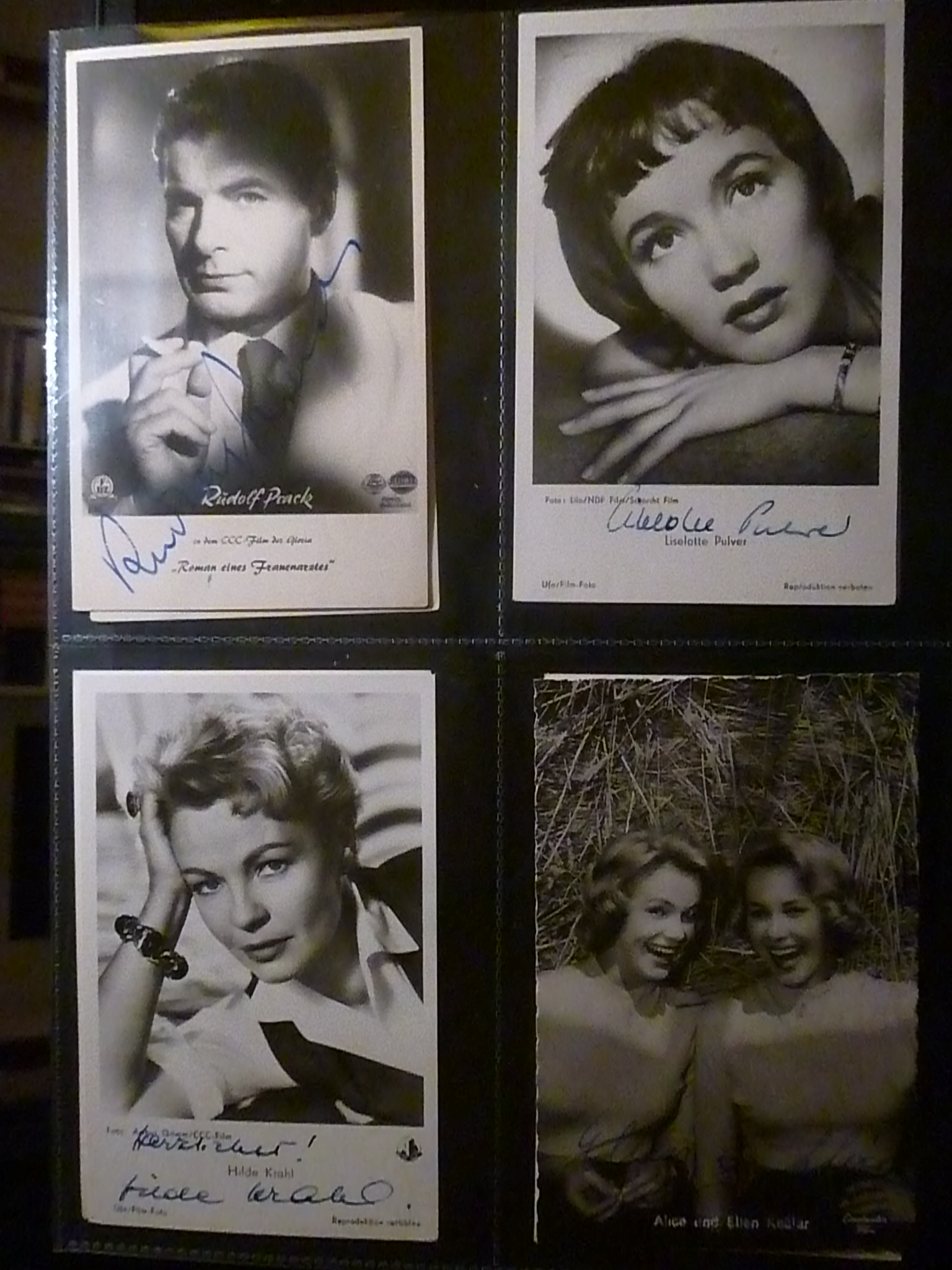 Ich habe meine Kindheit und Großteil der Jugend in der DDR verbracht. Dort konnte man ab und zu westliche und internationale Filme sehen, was ich mit Begeisterung tat. Zu jedem Film gab es ein Programmheft , wo auch die Adressen der Hauptdarsteller gezeigt wurden. Ich kannte bald alle westlichen Filmstars, verehrte sie unendlich, war ein schwärmerischer Backfisch von 15/16 Jahren und begann, Briefe an sie zu schreiben mit dem Wunsch, mir ein Autogramm zu schicken. Es klappte tatsächlich und ich bekam über 50 Schwarzweiss-Postkarten mit Original-Autogrammen und Widmungen (ein paar Beispiele anbei). Es war sehr spannend und immer, wenn ich aus der Schule kam, war meine erste Frage: „Mutti, ist Post für mich da?“