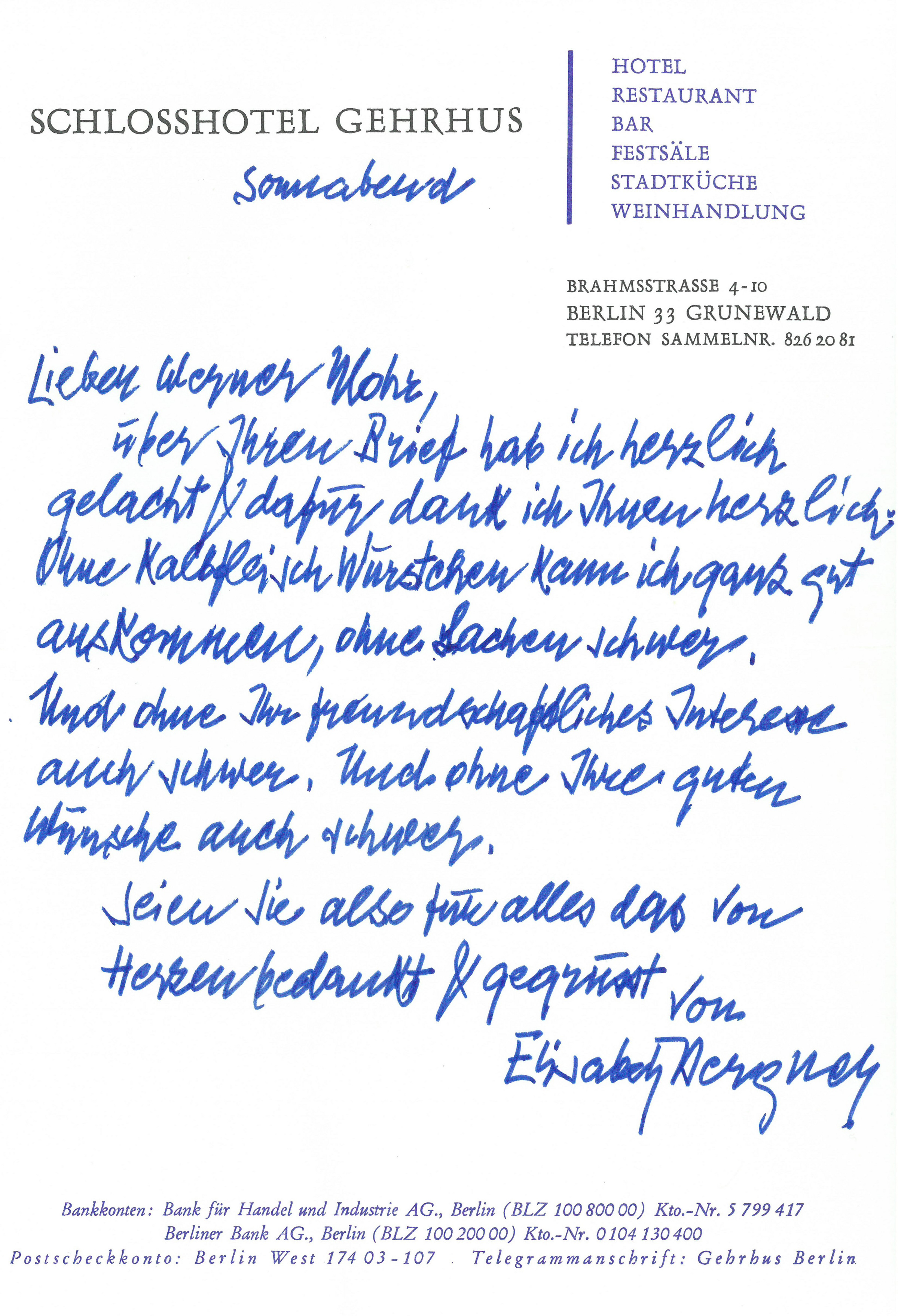 Asta Nielsen besuchte ich während eines Urlaubs in Kopenhagen, ein unvergesslicher Eindruck, und Grete Mosheim sowie Elisabeth Bergner konnte ich glücklicherweise des Öfteren im Theater erleben. Kurioserweise kreuzte Elisabeth Bergner erneut meinen Weg: 1978 drehte sie mit Martin Held den Film DER PFINGSTAUSFLUG (R: Michael Günther). Durch Zufall kam meine Mutter am Drehort vorbei und schnappte die Bemerkung auf, wie Frau Bergner von Kalbfleischwürstchen schwärmte. Das nahm ich als Gelegenheit ihr ein paar Zeilen zu schreiben. Sie antwortete darauf in sehr charmanter Weise. Ihren Brief und die mitgesandte Autogrammkarte ist für mich ein absolutes Highlight meiner Sammlung.