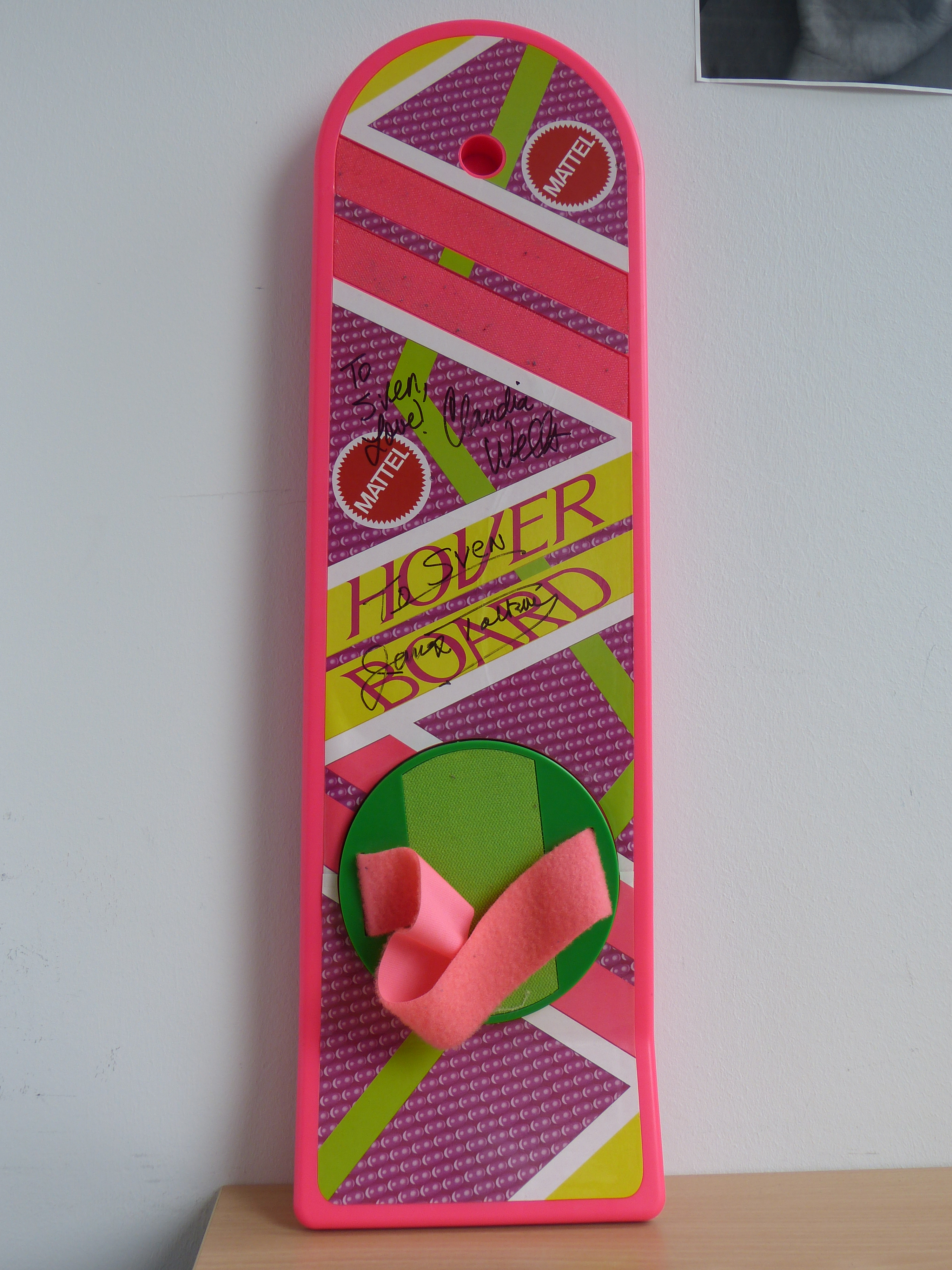 Das berühmte Hoverboard aus ZURÜCK IN DIE ZUKUNFT 2. Signiert von Claudia Wells, Jennifer Parker aus Teil 1 und James Tolkan, Schuldirektor Strickland. Diese, von Mattel lizensierte, Edition erschien Ende 2012 als limitierte Auflage und funktioniert auch 2015 immer noch nicht auf Wasser…