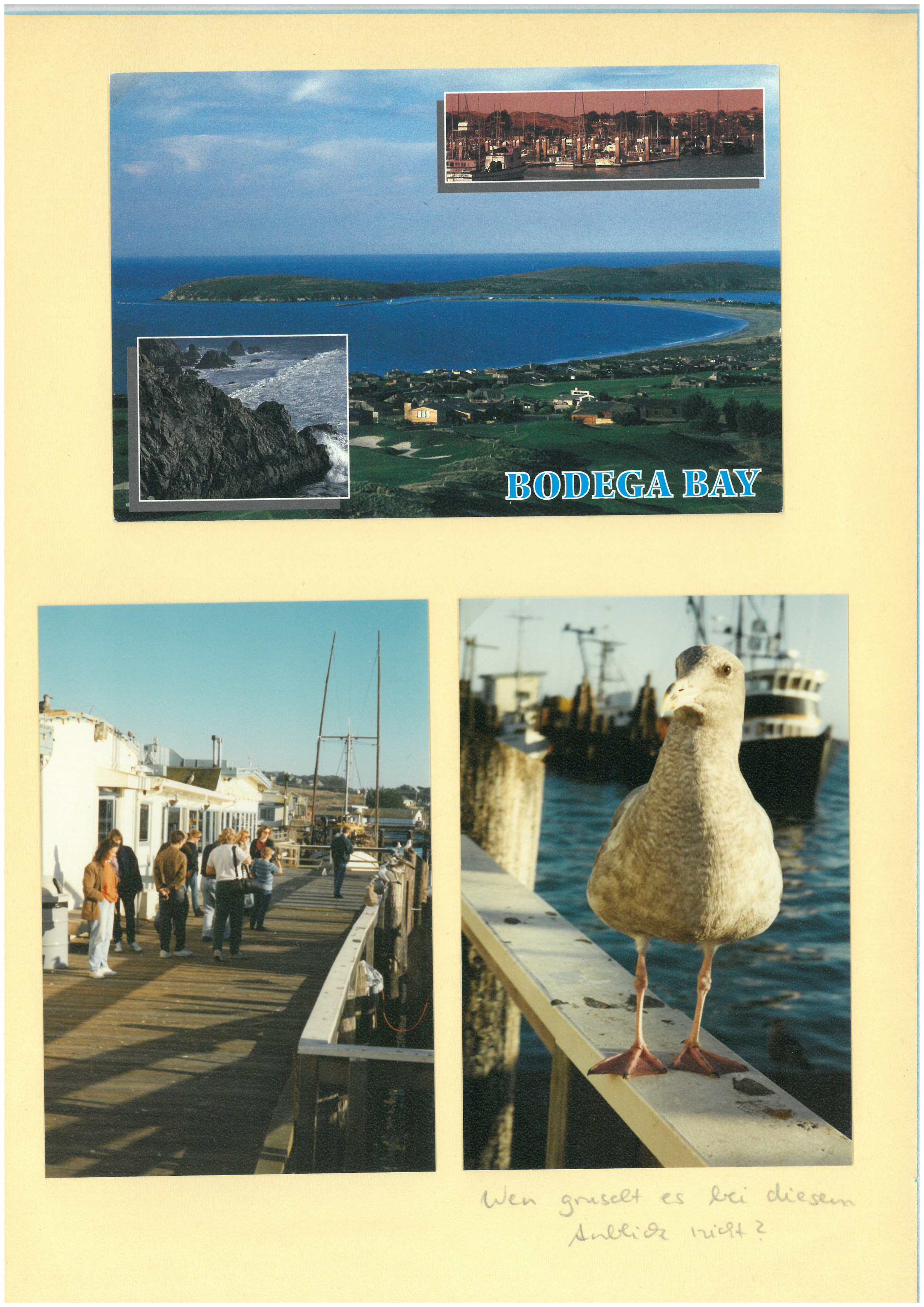 Das eigentliche Highlight aber war für mich die Bodega Bay, wo Alfred Hitchcock den Film THE BIRDS (Die Vögel, US 1963) drehte. Wir konnten uns am Steg frei durch die großen Möwen mit ihren riesigen Schnäbeln bewegen, während wir in Erinnerung schwelgten und uns Schauer über den Rücken liefen. Wir bekamen auch die Schule und die Kirche zu sehen, die räumlich ein Stück auseinander lagen. Allerdings wurden alle Innenaufnahmen im Studio gedreht und die Gebäude wurden nur für die Außenaufnahmen verwendet. Für mich war das ein unbeschreibliches Gefühl, diese Schauplätze besichtigen zu können. Bis heute noch interessiere ich mich für Drehorte in Städten und schaue gerne Filmkulissen an.